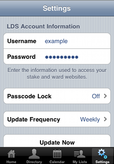 Version 3 of My LDS Stake introduced a new security feature: passcodes. Similar to the passcode feature on your iPhone/iPod touch, you can set a four-digit passcode which will be required to start the app. This is another layer of defense that protects your ward and stake information from getting into the wrong hands.