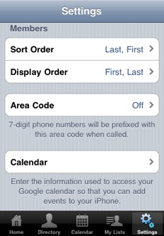 Members are sorted by their last name, but displayed in a first name, last name fashion. If you want to change either the sort order or the way it's displayed, you tap the Sort Order or Display Order in the Settings screen.