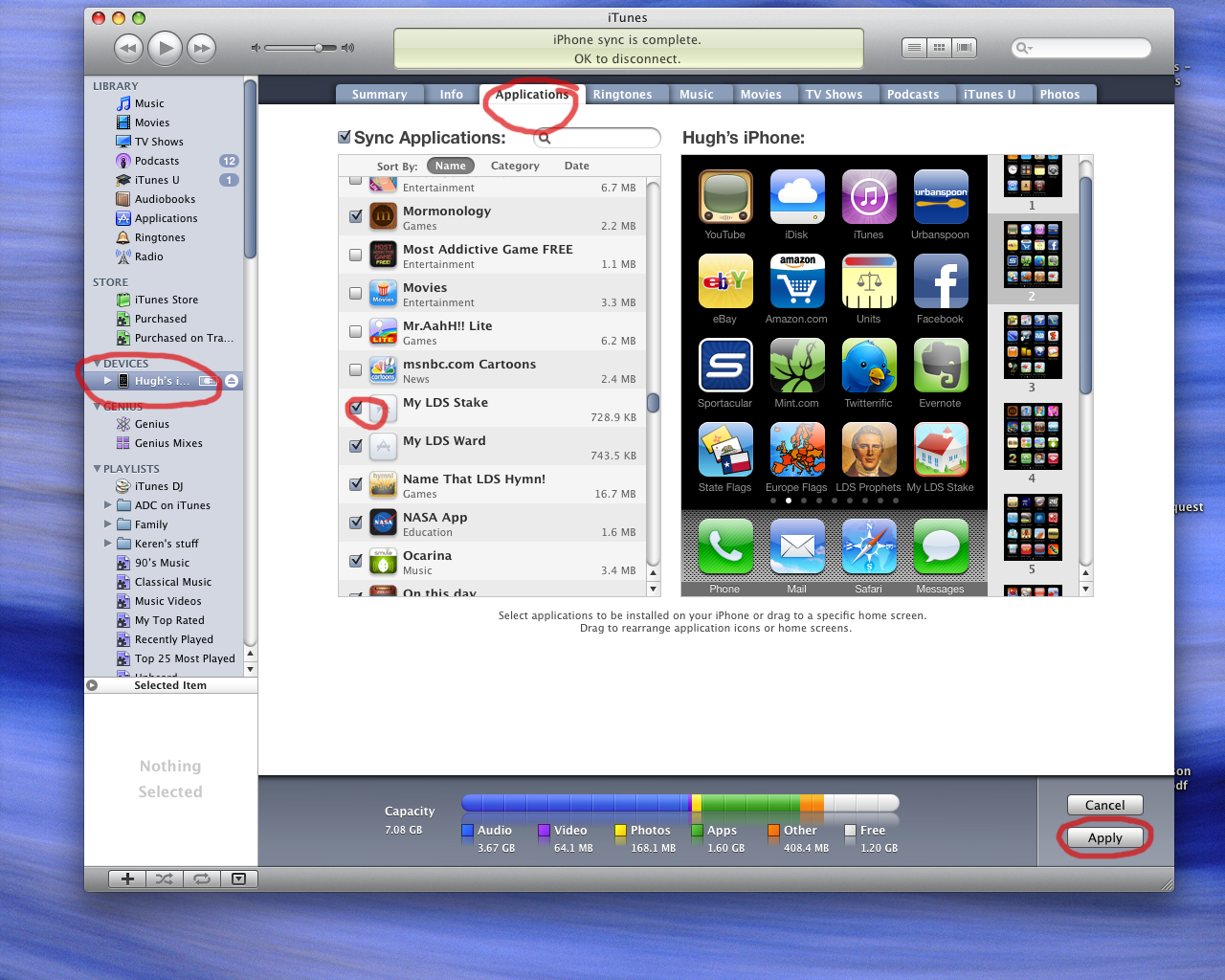 Press the 'x' to delete the app. Reconnect to your iTunes library on your computer and let it sync. You'll want to ensure that you look under the Applications tab when you click on your device in iTunes and see that My LDS Stake is checked.