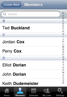 Given that, when you display a list of members of your ward or stake, you'll probably want to see them as you'd say it—first name, last name. That's the default view for My LDS Stake, as shown to the right.
